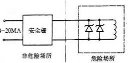 3)本質安全定位器必須與關聯設備安全柵配套使用,安全柵的安裝、調試必須嚴格按安全柵的說明進行。連接導線或電纜高分布電容<0.03uF,高分布電感<1.0mH。其接線框圖如下:?